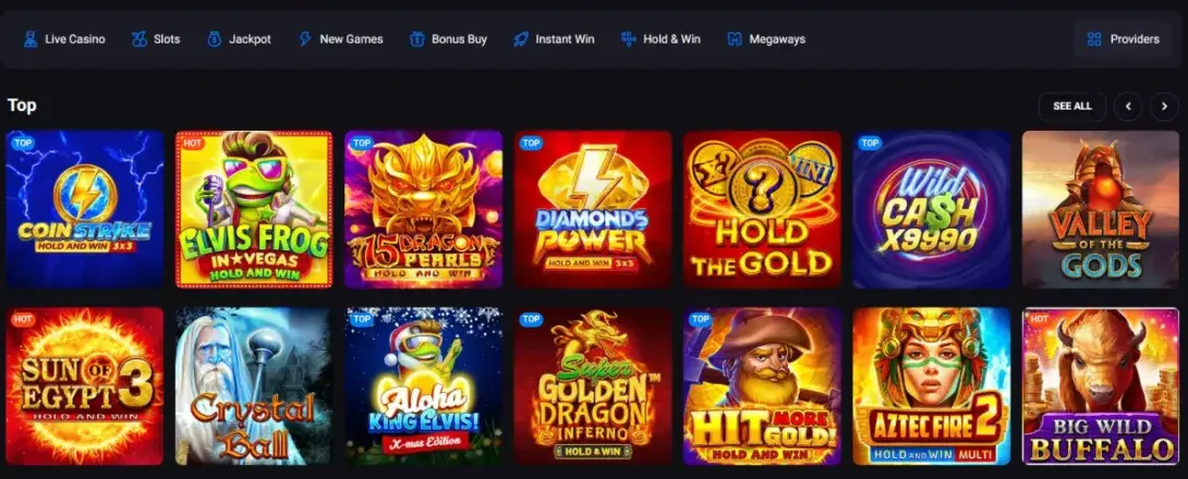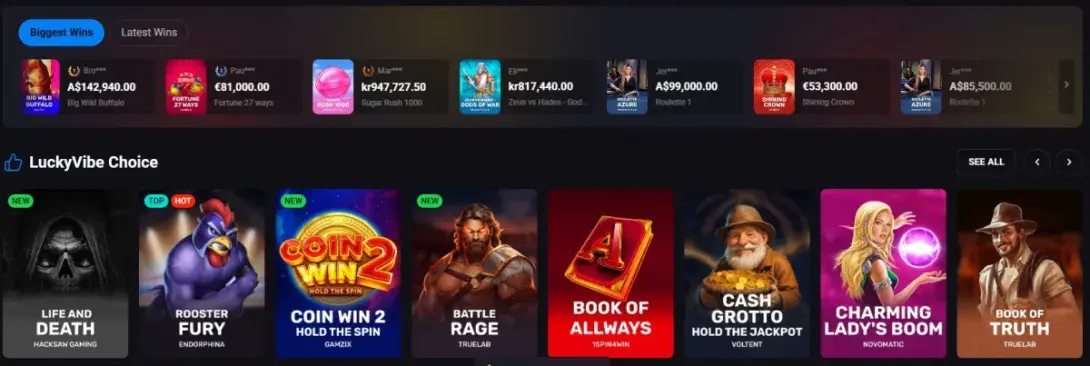 Luckyvibe slots dominate a library exceeding 10,000 titles from 150+ providers like NetEnt, Pragmatic Play, Evolution, and BGaming. Slots range from classics to Megaways like Boom City (96% RTP), with progressives hitting AU$1M. Table games feature blackjack variants (Power Up, Oasis) and roulette (Gravity Auto, Lucky 6). Live casino impresses with 12 providers, including Evolution's Mega Wheel and Pragmatic's Sweet Bonanza Candyland.